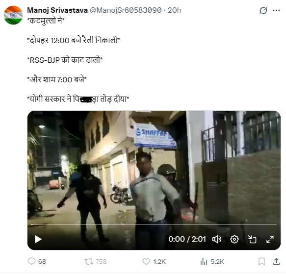 सोशल मीडिया पर लगातार फेक न्यूज फैलाने वाले मनोज श्रीवास्तव नामक यूजर ने वीडियो शेयर करते हुए लिखा, ‘*कटमुल्लो ने* *दोपहर 12:00 बजे रैली निकाली* *RSS-BJP को काट डालो* *और शाम 7:00 बजे* *योगी सरकार ने पि#$ड़ा तोड़ दीया*’