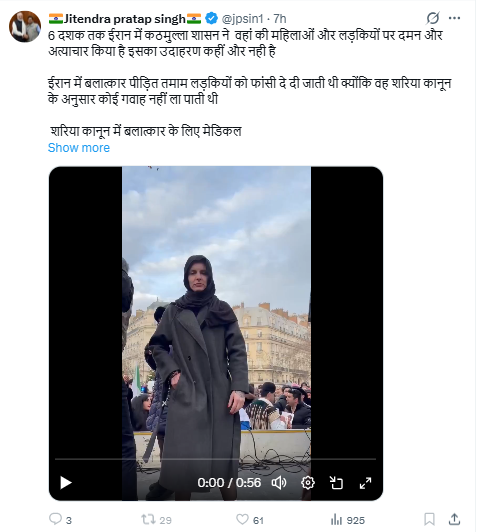 इस वीडियो को शेयर करते हुए Abhay Pratap Singh नामक यूजर ने लिखा, ‘ईरान की इस बहादुर लड़की को देखिए खामनेई की इस्लामिक सत्ता के खिलाफ बुर्का उतारकर खुला मोर्चा खोल दिया है बुर्का उतार फेंका और टॉप पर लिखा है F**k Khamenei Iran से इस्लामिक सत्ता के खिलाफ लड़कियां सबसे आगे हैं वहीं भारत की फेमिनिस्ट मादाएं हिजाब के समर्थन में लुंगी डांस करती हैं’