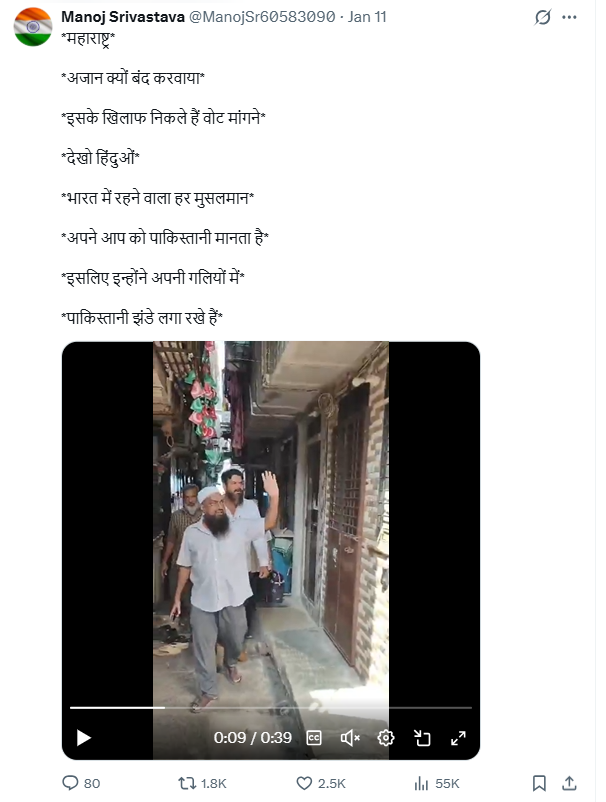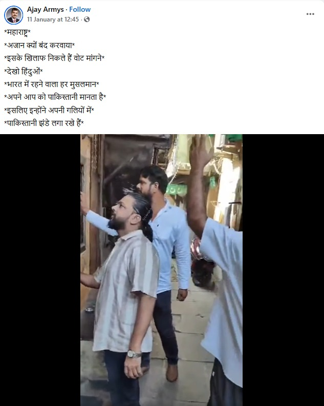 मनोज कुमार श्रीवास्तव नामक यूजर ने वीडियो शेयर कर लिखा, ‘*महाराष्ट्र* *अजान क्यों बंद करवाया* *इसके खिलाफ निकले हैं वोट मांगने* *देखो हिंदुओं* *भारत में रहने वाला हर मुसलमान* *अपने आप को पाकिस्तानी मानता है* *इसलिए इन्होंने अपनी गलियों में* *पाकिस्तानी झंडे लगा रखे हैं*’