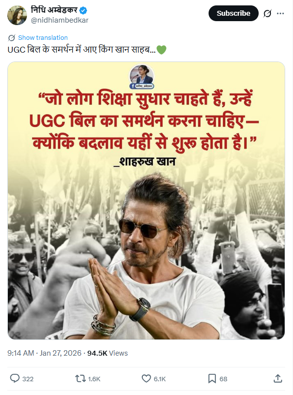 निधि अंबेडकर नामक यूजर ने शाहरुख खान के बयान का पोस्टकार्ड शेयर करते हुए लिखा, ‘UGC बिल के समर्थन में आए किंग खान साहब..’