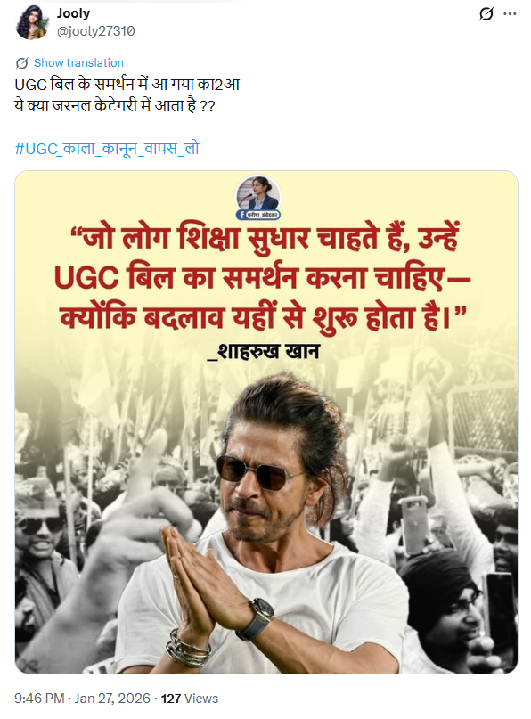 विश्वविद्यालय अनुदान आयोग (यूजीसी) के नए नियमों को लेकर देशभर में हंगामा मचा हुआ है। इस बीच सोशल मीडिया पर दावा किया जा रहा है कि फिल्म अभिनेता शाहरुख खान ने यूजीसी के नियमों का समर्थन किया और उन्होंने यह बयान दिया है कि, ‘शिक्षा में सुधार के लिए UGC बिल का समर्थन होना चाहिए, क्योंकि बदलाव यहीं से शुरु होता है।’ कई यूजर्स शाहरुख खान के बयान के पोस्टकार्ड को शेयर करते हुए तारीफ कर रहे हैं, तो वहीं कई यूजर्स उनकी आलोचना कर रहे हैं।
