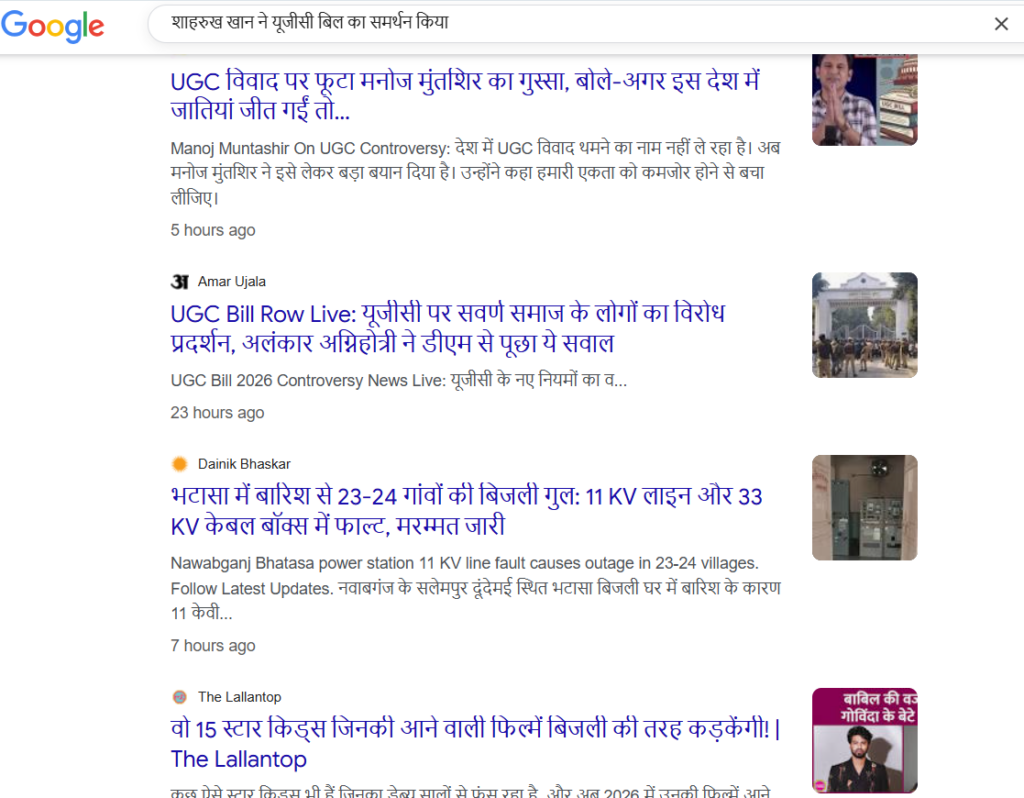 हमारी टीम ने वायरल बयान के संदर्भ में शाहरुख खान के एक्स (पूर्व ट्विटर), इंस्टाग्राम और फेसबुक अकाउंट्स को देखा। हमें, शाहरुख का ऐसा कोई बयान उनके सोशल मीडिया हैंडल्स पर नहीं मिला। इसके बाद हमारी टीम ने शाहरुख के वायरल बयान के संदर्भ में गूगल पर कुछ कीवर्ड्स भी सर्च किया। लेकिन हमें, किसी भी मुख्यधारा की मीडिया द्वारा प्रकाशित ऐसी कोई न्यूज नहीं मिली, क्योंकि अगर शाहरुख खान ने यूजीसी नियमों के समर्थन में इस तरह का कोई भी बयान दिया होता, तो यह मीडिया की सुर्खियों में जरूर होता।
