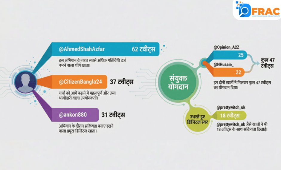 इसके बाद @CitizenBangla24 (37 ट्वीट्स) और @ankon880 (31 ट्वीट्स) जैसे अकाउंट्स सेकेंडरी एम्प्लीफायर की भूमिका में दिखते हैं। ये अकाउंट्स मुख्य मैसेज को दोहराने, ट्रेंड को जीवित रखने और हैशटैग की विज़िबिलिटी बढ़ाने का काम करते हैं। @Opinion_A2Z (25 ट्वीट्स) और @NHusain_ (22 ट्वीट्स) मध्यम स्तर की सक्रियता दिखाते हैं, जो लगातार अंतराल पर कंटेंट डालकर नैरेटिव को स्थायी बनाए रखने की रणनीति अपनाई गई है। कम संख्या में ट्वीट करने वाले अकाउंट्स—जैसे @prettywitch_uk (18), @Newdesh24 (11), @HridoyBD36 (4) और @Yours_Hiccup (2)—की भूमिका भी कम महत्वपूर्ण नहीं है। ऐसे अकाउंट्स अक्सर रीट्वीट, कोट ट्वीट या चयनित समय पर पोस्ट डालकर अभियान को ऑर्गैनिक और विविध दिखाने का काम करते हैं, ताकि यह किसी एक स्रोत से संचालित न लगे। समग्र रूप से देखें तो यह पैटर्न एक कोर–परिधि (core–periphery) मॉडल की ओर इशारा करता है, जहां कुछ अकाउंट्स भारी मात्रा में कंटेंट प्रोड्यूस कर रहे हैं, जबकि अन्य अकाउंट्स उसी कंटेंट को सपोर्ट और एम्प्लीफाई कर रहे हैं। यह संरचना आमतौर पर संगठित ऑनलाइन अभियानों में देखी जाती है, जहां उद्देश्य केवल पोस्ट करना नहीं, बल्कि ट्रेंड बनाना, नैरेटिव को सामान्य बनाना और उसे लंबे समय तक डिजिटल स्पेस में जीवित रखना होता है।