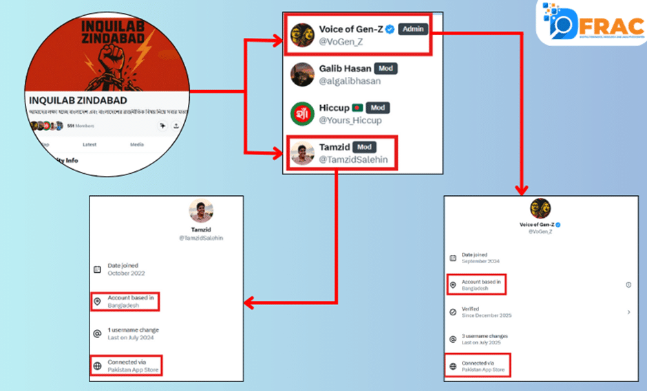 पहले ग्राफिक में दिखाया गया “Inquilab Zindabad” नेटवर्क इस पैटर्न को स्पष्ट रूप से दर्शाता है। इस नेटवर्क में Voice of Gen-Z (@VoGen_Z) जैसे अकाउंट्स की भूमिका प्रमुख दिखाई देती है, जहां एडमिन और मॉडरेटर स्तर पर Hiccup (@Yours_Hiccup) और Tamzid Salehin जैसे यूज़र्स शामिल हैं। प्रोफाइल जानकारी के अनुसार, Tamzid का अकाउंट “Account based in Bangladesh” दिखाता है, लेकिन साथ ही “Connected via Pakistan App Store” जैसे संकेत मौजूद हैं। यही पैटर्न Voice of Gen-Z अकाउंट में भी देखा गया, जो स्वयं को बांग्लादेश-आधारित दर्शाता है, लेकिन तकनीकी रूप से पाकिस्तानी App Store से कनेक्टेड पाया गया। यह विरोधाभास केवल लोकेशन तक सीमित नहीं है, बल्कि यह नेटवर्क संचालन और कंटेंट मैनेजमेंट के स्तर पर भी दिखाई देता है। एक ही नेटवर्क के भीतर मौजूद कई अकाउंट्स का पाकिस्तान-आधारित ऐप इंफ्रास्ट्रक्चर से जुड़ा होना इस संभावना को मजबूत करता है कि यह गतिविधि किसी एक देश तक सीमित न होकर क्रॉस-बॉर्डर डिजिटल कोऑर्डिनेशन का हिस्सा है।