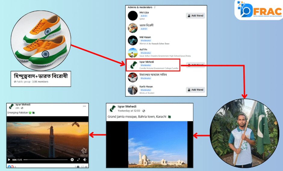 वहीं फेसबुक आधारित नेटवर्क का विश्लेषण इस पैटर्न को और मजबूत करता है। यहां “হিন্দুবাদ+ভারত বিরোধী” (Hindubad + Bharat Birodhi) जैसे ग्रुप्स के मॉडरेशन ढांचे में Iqrar Mehdi जैसे यूज़र्स की भूमिका दिखाई देती है। उपलब्ध प्रोफाइल और पोस्ट्स के अनुसार, यह अकाउंट पाकिस्तान के कराची (Grand Jamia Mosque, Bahria Town) जैसे स्थानों से जुड़ा कंटेंट साझा करता है, जबकि ग्रुप का समग्र नरेटिव बांग्लादेश-केंद्रित और भारत-विरोधी है।