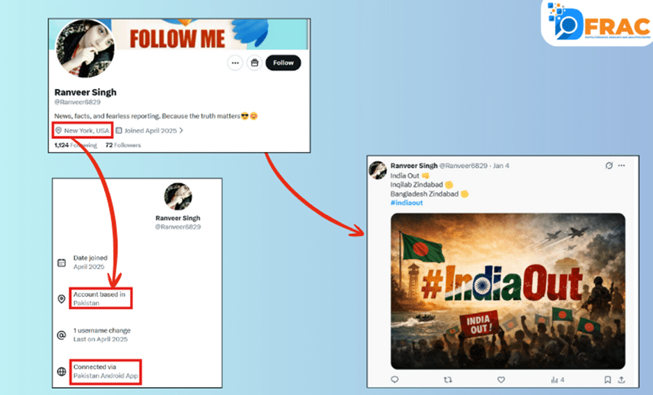 इस रिपोर्ट के दौरान यह एक महत्वपूर्ण पैटर्न के रूप में सामने आया कि भारत-विरोधी ऑनलाइन अभियानों में शामिल कई यूज़र्स स्वयं को बांग्लादेश-आधारित या बांग्लादेश से संचालित बताने का दावा करते हैं। हालांकि, X (ट्विटर) पर उपलब्ध अकाउंट मेटाडेटा, कनेक्टेड ऐप्स और लोकेशन संकेतकों का विश्लेषण इस दावे से मेल नहीं खाता।