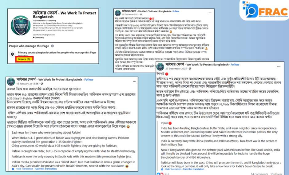 फेसबुक पर সাইবার ফোর্স – We Work To Protect Bangladesh (साइबर फोर्स-हम बांग्लादेश की रक्षा के लिए काम करते हैं) नामक एक कम्यूनिटी ग्रुप है। इस ग्रुप का संचालन इसी नाम से बनाए गए एक फेसबुक पेज द्वारा किया जाता है। पेज पर साझा किए गए पोस्ट्स का विश्लेषण बताता है कि इसमें भारत को लगातार एक आक्रामक, हस्तक्षेपकारी और अस्थिरता पैदा करने वाली ताकत के रूप में चित्रित किया गया है। कुछ पोस्ट्स में भारत को क्षेत्रीय असंतुलन का कारण बताने की कोशिश की गई है, जबकि पाकिस्तान और चीन को रणनीतिक संतुलन या वैकल्पिक शक्ति के रूप में अप्रत्यक्ष रूप से सकारात्मक संदर्भों में दिखाया गया है। यह फ्रेमिंग सामान्य आलोचना से आगे बढ़कर जियोपॉलिटिकल नरेटिव इंजीनियरिंग की ओर इशारा करती है। इस यूजर ने कई पोस्ट में भारत के भूराजनैतिक दृष्टिकोण से महत्वपूर्ण जगहों जैसे चिकन नेक यानी सिलिगुड़ी कॉरीडोर को कट करके पूर्वोत्तर के राज्यों से संपर्क तोड़ने की बात भी कही है।