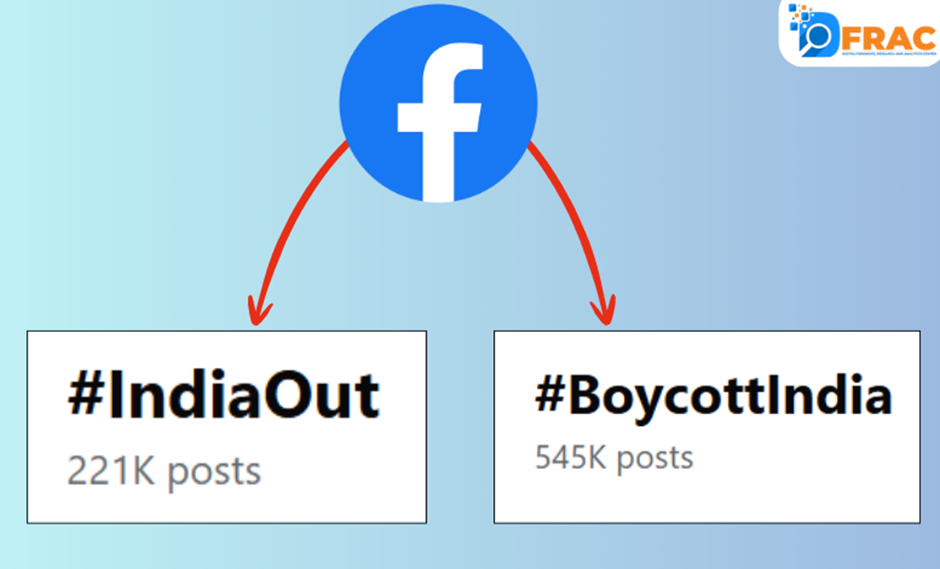 वहीं #IndiaOut हैशटैग के अंतर्गत लगभग 2.21 लाख पोस्ट की गई हैं। यह हैशटैग सीधे तौर पर भारत को अंतरराष्ट्रीय मंचों पर अलग-थलग दिखाने और उसके खिलाफ जनमत तैयार करने की कोशिश से जुड़ा प्रतीत होता है। संख्या के लिहाज से यह #BoycottIndia से कम है, लेकिन दोनों हैशटैग्स की समान प्रकृति और समान समयावधि में सक्रियता यह दर्शाती है कि ये अलग-अलग नहीं, बल्कि एक ही व्यापक भारत-विरोधी अभियान के हिस्से हो सकते हैं। दोनों हैशटैग्स को मिलाकर कुल पोस्ट्स की संख्या 7.66 लाख से अधिक हो जाती है, जो Facebook जैसे बड़े सोशल मीडिया प्लेटफॉर्म पर भारत-विरोधी कंटेंट के व्यापक प्रसार की ओर संकेत करती है। कंटेंट की मात्रा और उसका दोहराव यह दर्शाता है कि यह केवल व्यक्तिगत यूजर्स की अभिव्यक्ति नहीं है, बल्कि इसमें पेजों, ग्रुप्स और संभवतः क्रॉस-प्लेटफॉर्म नेटवर्क्स की भूमिका भी हो सकती है।