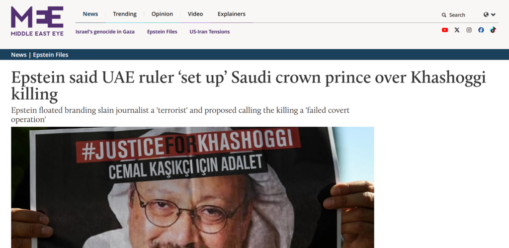 इसके बाद DFRAC की टीम ने मोहम्मद बिन ज़ायद अल नाहयान और जेफरी एपस्टीन फाइल्स को लेकर अलग-अलग कीवर्ड्स सर्च किया। इस दौरान हमें मिडिल-ईस्ट आई की एक रिपोर्ट मिली, जिसमें यह उल्लेख है कि जेफरी एपस्टीन ने सऊदी अरब के पत्रकार जमाल खशोगी की हत्या के बाद निजी बातचीत में यूएई के शासक मोहम्मद बिन ज़ायद अल नहयान का नाम लेते हुए यह आशंका जताई थी कि सऊदी क्राउन प्रिंस को फंसाया जा सकता है। हालांकि, इस रिपोर्ट में कहीं भी वायरल तस्वीर का उल्लेख नहीं है और न ही यह कहा गया है कि ऐसी कोई तस्वीर एपस्टीन फाइल्स का हिस्सा है।