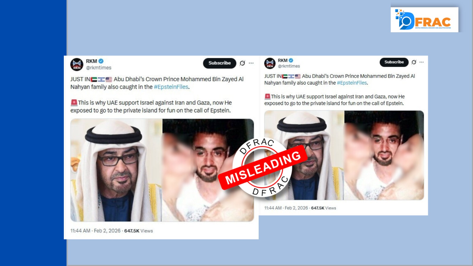 DFRAC के फैक्ट चेक से यह स्पष्ट होता है कि वायरल तस्वीर में अबू धाबी के क्राउन प्रिंस मोहम्मद बिन ज़ायद अल नाहयान नहीं है। साथ ही, इस तस्वीर का जेफरी एपस्टीन फाइल्स से भी कोई संबंध नहीं हैं | तस्वीर को गलत पहचान और भ्रामक दावे के साथ सोशल मीडिया पर शेयर किया जा रहा है। इसलिए यूज़र्स का दावा गलत है।