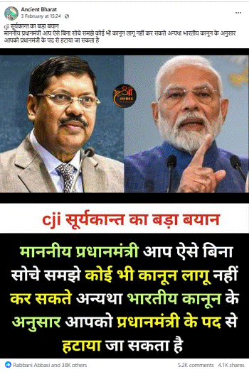 सोशल साइट फेसबुक पर ‘ANCIENT’ नामक यूजर ने एक इन्फोग्राफिक शेयर किया है, जिस पर टेक्स्ट लिखा है – “cji सूर्यकान्त का बड़ा बयान माननीय प्रधानमंत्री आप ऐसे बिना सोचे समझे कोई भी कानून लागू नहीं कर सकते अन्यथा भारतीय कानून के अनुसार आपको प्रधानमंत्री के पद से हटाया जा सकता है”