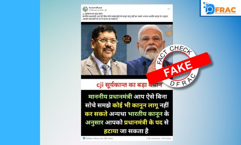 DFRAC के फैक्ट चेक से स्पष्ट होता है कि वायरल इन्फोग्राफिक में CJI जस्टिस सूर्यकांत द्वारा प्रधानमंत्री नरेंद्र मोदी को बिना सोचे-समझे कानून लागू करने पर पद से हटाने की चेतावनी देने का दावा पूरी तरह से फेक है।