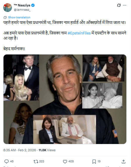 इन तस्वीरों को शेयर करते हुए एक यूजर ने लिखा, ‘पहले हमारे पास ऐसा प्रधानमंत्री था, जिसका नाम हार्वर्ड और ऑक्सफ़ोर्ड में लिया जाता था। अब हमारे पास ऐसा प्रधानमंत्री है, जिसका नाम #EpsteinFiles में एपस्टीन के साथ सामने आ रहा है। बेहद शर्मनाक!!