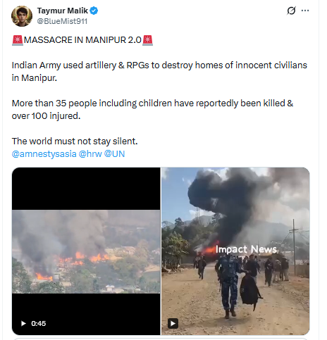 एक यूजर ने दो वीडियो शेयर करते हुए लिखा, ‘मणिपुर में नरसंहार 2.0. भारतीय सेना ने मणिपुर में बेगुनाह लोगों के घरों को तबाह करने के लिए आर्टिलरी और RPG का इस्तेमाल किया। खबर है कि बच्चों समेत 35 से ज़्यादा लोग मारे गए हैं और 100 से ज़्यादा घायल हुए हैं। दुनिया को चुप नहीं रहना चाहिए।’