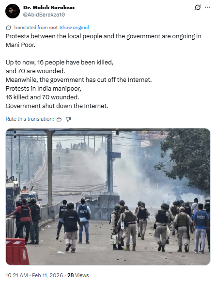वहीं एक अन्य यूजर ने एक तस्वीर शेयर करते हुए लिखा, ‘मणिपुर में स्थानीय लोगों और सरकार के बीच विरोध प्रदर्शन जारी है। अब तक 16 लोग मारे गए हैं और 70 घायल हैं। इस बीच, सरकार ने इंटरनेट बंद कर दिया है।’