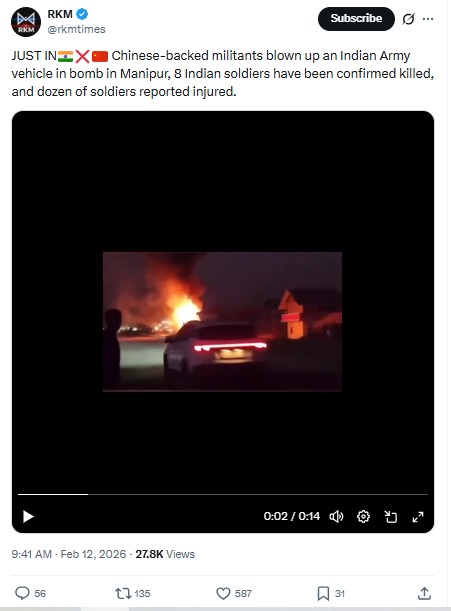 इस वीडियो को शेयर करते हुए एक यूजर ने लिखा, ‘चीन समर्थित उग्रवादियों ने मणिपुर में भारतीय सेना की गाड़ी को बम से उड़ा दिया, 8 भारतीय सैनिकों के मारे जाने की पुष्टि हुई है, और दर्जनों सैनिक घायल बताए गए हैं।’