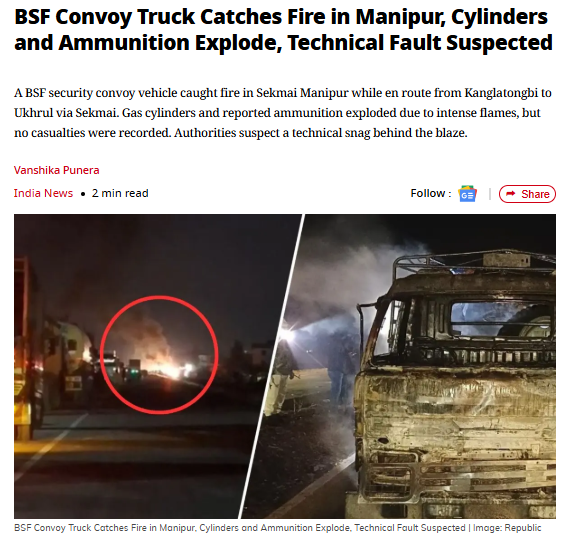 DFRAC की टीम ने जांच में पाया कि मणिपुर में 8 भारतीय जवानों के मारे जाने का दावा पूरी तरह से फेक है। दरअसल वायरल वीडियो किसी उग्रवादी हमले का नहीं है, बल्कि बीएसएफ के खाद्यान्न ले जाने वाले ट्रक में लगी आग का वीडियो है। हमारी टीम को जांच के दौरान रिपब्लिक की एक रिपोर्ट मिली, जिसके साथ जानकारी दी गई है, ‘मणिपुर के सेकमाई में कांगलातोंगबी से सेकमाई होते हुए उखरुल जा रहे बीएसएफ सुरक्षा काफिले के एक वाहन में आग लग गई। भीषण आग के कारण गैस सिलेंडर और गोला-बारूद में विस्फोट हो गया, लेकिन कोई हताहत नहीं हुआ। अधिकारियों का मानना ​​है कि आग लगने का कारण कोई तकनीकी खराबी थी। बीएसएफ कर्मियों के अनुसार, ट्रक में रसोई और भोजन सामग्री, जिनमें गैस सिलेंडर भी शामिल था। आग तेज होने पर और अत्यधिक गर्मी और दबाव के कारण सिलेंडर फट गए, जिससे लपटें और भी बढ़ गईं।’