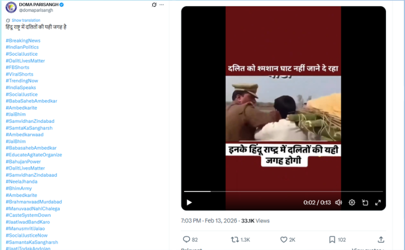 सोशल साइट X पर Doma Parisangh नामक अकाउंट ने वीडियो शेयर कर लिखा “हिंदू राष्ट्र में दलितों की यही जगह है | “