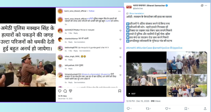 वायरल वीडियो के की-फ्रेम्स को रिवर्स इमेज सर्च करने पर हमे यह वीडियो एक इंस्टाग्राम अकाउंट पर पोस्ट मिला, जिसके साथ जानकारी दी गई है कि अमेठी पुलिस मक्खन सिंह के हत्यारों को पकड़ने की बजाय परिजनों को ही धमकी दे रही है। आगे की जांच में हमें भारत समाचार की आधिकारिक X हैंडल पर 15 दिसंबर 2025 को पोस्ट मिला | इस वीडियो के साथ जानकारी दी गई है ” अमेठी : श्मशान के केयरटेकर की हत्या का मामला | परिजनों ने अंतिम संस्कार करने से किया मना | परिजनों की
