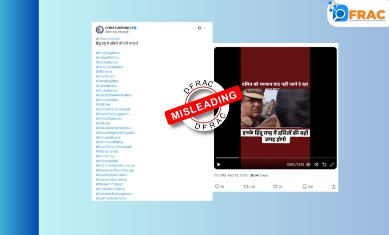 सोशल मीडिया प्लेटफार्म X पर एक वीडियो शेयर किया किया गया है, जिसमें देखा जा सकता है कि कुछ पुलिसकर्मी कंधे पर अर्थी ले जा रहे ग्रामीणों को रोकते हुए नज़र आ रहे हैं। इसी दौरान एक पुलिसवाले को ये भी कहते हुए सुना जा सकता है कि अनर्थ हो जायेगा | यूज़र्स इस वीडियो को पुलिस द्वारा दलित व्यक्ति के शव को श्मशान ले जाने से रोके जाने का बताकर शेयर कर रहे हैं।