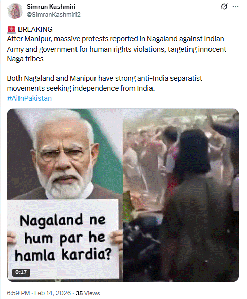 सोशल साइट X पर वेरिफाइड पाकिस्तानी यूजर ने वायरल वीडियो को शेयर कर लिखा कि मणिपुर के बाद, नागालैंड में भारतीय सेना और सरकार के खिलाफ़ बड़े पैमाने पर विरोध प्रदर्शन की खबरें हैं, जिसमें बेकसूर नागा जनजातियों को निशाना बनाकर मानवाधिकारों का उल्लंघन किया गया है। नागालैंड और मणिपुर दोनों में भारत से आज़ादी की मांग को लेकर मज़बूत भारत विरोधी अलगाववादी आंदोलन हैं।