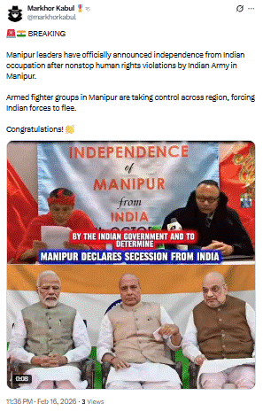 सोशल साईट एक्स पर वेरिफाइड पाकिस्तानी यूजर ज़र्द सी गाना ने वायरल वीडियो को शेयर कर लिखा कि मणिपुर में इंडियन आर्मी द्वारा लगातार ह्यूमन राइट्स के उल्लंघन के बाद मणिपुर के नेताओं ने ऑफिशियली इंडियन कब्जे से आज़ादी का ऐलान कर दिया है। मणिपुर में हथियारबंद फाइटर ग्रुप पूरे इलाके पर कब्ज़ा कर रहे हैं, जिससे इंडियन फोर्स को भागने पर मजबूर होना पड़ रहा है। बधाई हो!