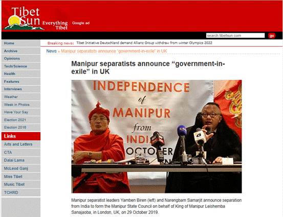 30 अक्टूबर 2019 को प्रकाशित इस रिपोर्ट के अनुसार, मणिपुर के दो अलगाववादी नेताओं ने, जो खुद को राजा लीशेम्बा सनाजाओबा का प्रतिनिधि बता रहे थे, यूनाइटेड किंगडम (UK) में “मणिपुर सरकार इन एग्ज़ाइल” (निर्वासित सरकार) बनाने की घोषणा की थी।