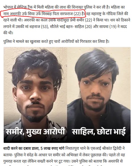 इस घटना के बारे में और ज्यादा जानकारी के लिए हमारी टीम ने निशातपुरा पुलिस थाने से संपर्क किया। पुलिस ने हमें बताया कि मृतका सिया उर्फ अशरफी मुस्लिम थी और उसके पिता का नाम सरफराज है।