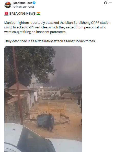 इस वीडियो को शेयर करते हुए Manipur Post नामक यूजर ने लिखा, ‘ब्रेकिंग न्यूज़। खबर है कि मणिपुर के लड़ाकों ने हाईजैक की हुई CRPF गाड़ियों से लिटन सारेखोंग CRPF स्टेशन पर हमला किया। ये गाड़ियां उन्होंने उन जवानों से ज़ब्त की थीं जो बेगुनाह प्रदर्शनकारियों पर गोली चलाते पकड़े गए थे। उन्होंने इसे भारतीय सेना के खिलाफ जवाबी हमला बताया।’