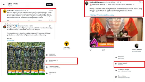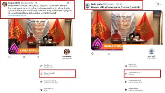 मणिपुर को लेकर एक समन्वित डिजिटल नैरेटिव बनाने की कोशिशें की जा रही हैं, जिसमें अलग-अलग देशों से संचालित अकाउंट्स ने एक ही वीडियो और लगभग समान भाषा का उपयोग किया है। इस प्रोपेगेंडा में Samaira Rind और Mehr Gadh जैसे अकाउंट्स दिखाई देते हैं, जिनकी प्रोफाइल जानकारी के अनुसार उनका लोकेशन पाकिस्तान से जुड़ी है। दोनों ने लगभग समान शब्दों में एक पोस्ट में यह भ्रामक दावा शेयर किया कि मणिपुर ने भारत से आधिकारिक स्वतंत्रता की घोषणा कर दी है। इस भ्रामक पोस्ट में न केवल वीडियो समान है, बल्कि पोस्ट का फ्रेमिंग और शब्द चयन भी काफी हद तक मेल खाता है। यह समानता केवल संयोग नहीं लगती, बल्कि एक साझा नैरेटिव टेम्पलेट की ओर संकेत करती है।.