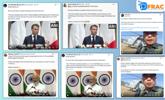 इन यूजर्स के पोस्ट के तुलनात्मक विश्लेषण से एक महत्वपूर्ण पैटर्न सामने आता है। अलग-अलग X अकाउंट्स द्वारा शेयर की गई पोस्ट्स में न केवल समान वीडियो क्लिप का उपयोग किया गया है, बल्कि टेक्स्ट संरचना, शब्द चयन, और नैरेटिव फ्रेमिंग भी अत्यंत समान दिखाई देती है। यह समानता स्वतःस्फूर्त या संयोगवश प्रतीत नहीं होती। उदाहरण के लिए, फ्रांस के राष्ट्रपति इमैनुएल मैक्रों के शेयर किए गए अल्टर्ड वीडियो वाले पोस्ट्स में “We have already lost a billion-dollar Rafale market…” जैसे वाक्यांश लगभग हूबहू दोहराए गए हैं। इसी प्रकार, भारतीय प्रधानमंत्री नरेंद्र मोदी के शेयर किए गए अल्टर्ड वीडियो से संबंधित पोस्ट्स में भी “India is going to make historic missile deal…” या “Now if Pakistan decides to destroy 10 or 200 Rafales…” जैसी पंक्तियाँ शब्दशः दोहराई गई हैं। अलग-अलग अकाउंट्स पर पोस्ट होने के बावजूद कंटेंट का संरचनात्मक पैटर्न समान है, जिसमें शीर्षक, उद्धरण शैली और भावनात्मक निष्कर्ष तक शामिल है।