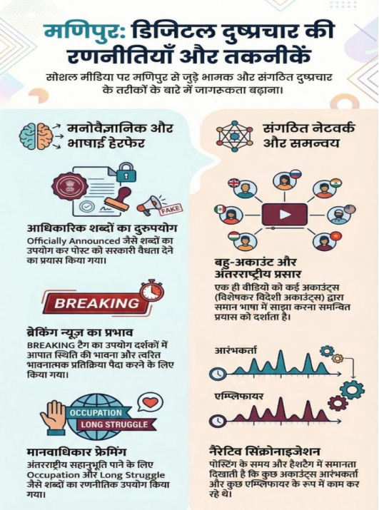 मणिपुर से जुड़े वायरल कंटेंट के विश्लेषण से कई संगठित दुष्प्रचार तकनीकों की पहचान होती है। ये तकनीकें सूचना-युद्ध के स्थापित पैटर्न से मेल खाती हैं।