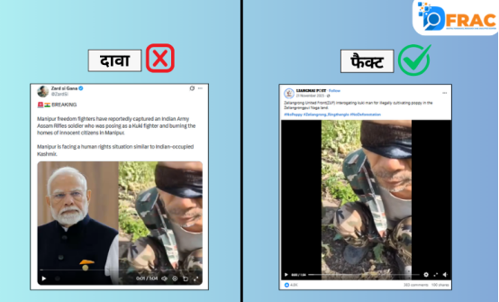 एक वीडियो के साथ भारतीय सेना के असम राइफल्स के जवान को मणिपुर में कुकी फाइटर बनकर लोगों के घरों में आग लगाते हुए पकड़े जाने का दावा किया गया। DFRAC की टीम ने वायरल वीडियो की जांच में पाया कि यह किसी भारतीय सैनिक का वीडियो नहीं है और ना ही यह वीडियो हाल-फिलहाल का है। यह वीडियो नवंबर 2025 से इंटरनेट पर मौजूद है और कई फेसबुक यूजर्स द्वारा पोस्ट किया गया है।
