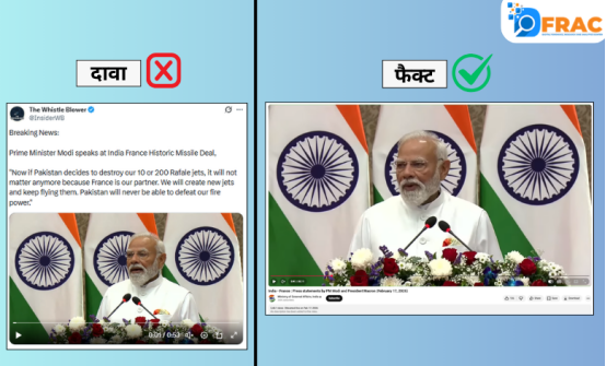 मुंबई में भारत-फ्रांस के बीच एक समिट हुई। इसी समिट में पीएम मोदी का दिया एक बयान शेयर किया गया है, जिसमें पीएम मोदी को कथित तौर पर पाकिस्तान द्वारा राफेट जेट मार गिराए जाने की बात कहते हुए सुना जा सकता है। हालांकि पीएम मोदी ने ऐसा कोई बयान नहीं दिया था, उनका वायरल बयान डिजिटली अल्टर्ड है।