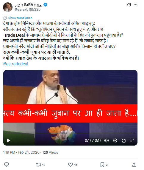 सोशल मीडिया पर केंद्रीय गृहमंत्री अमित शाह का एक बयान शेयर किया गया है। इस वीडियो को शेयर करने वाले यूजर्स का दावा है कि अमित शाह ने कहा कि अमेरिका से ट्रेड डील करके पीएम मोदी ने देश के किसानों के हितों को नुकसान पहुंचाया है। इस वीडियो में अमित शाह कहते हैं, ‘इंग्लैंड, इसके साथ हुए जो एफटीए और अमेरिका के साथ हुई ट्रेड डील, ये दोनों के माध्यम से मोदी जी ने किसानों के हित को नुकसान पहुंचाया है।’