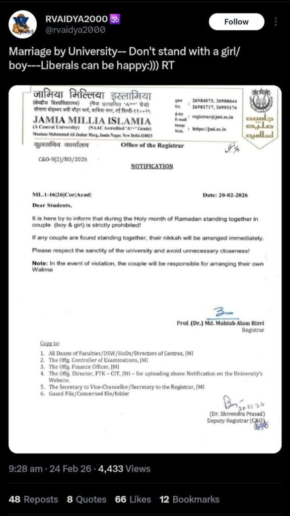 जामिया मिल्लिया इस्लामिया का एक नोटिस सोशल मीडिया पर शेयर किया गया, जिसमें कहा गया है कि रमज़ान के पवित्र महीने में यूनिवर्सिटी कैंपस में लड़कों और लड़कियों का एक साथ खड़ा होना मना है | दावा यह भी किया जा रहा है कि अगर कोई लड़की या लड़का साथ खड़े पाए जाते हैं, तो उनका तुरंत निकाह करा दिया जाएगा |