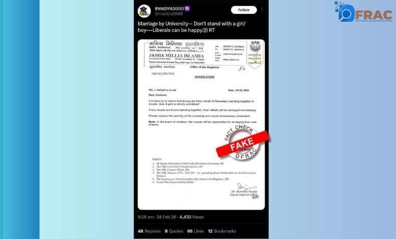 फैक्ट चेकः जामिया ने छात्र-छात्राओं को लेकर ‘निकाह’ नोटिस जारी नहीं किया, वायरल लेटर फेक है