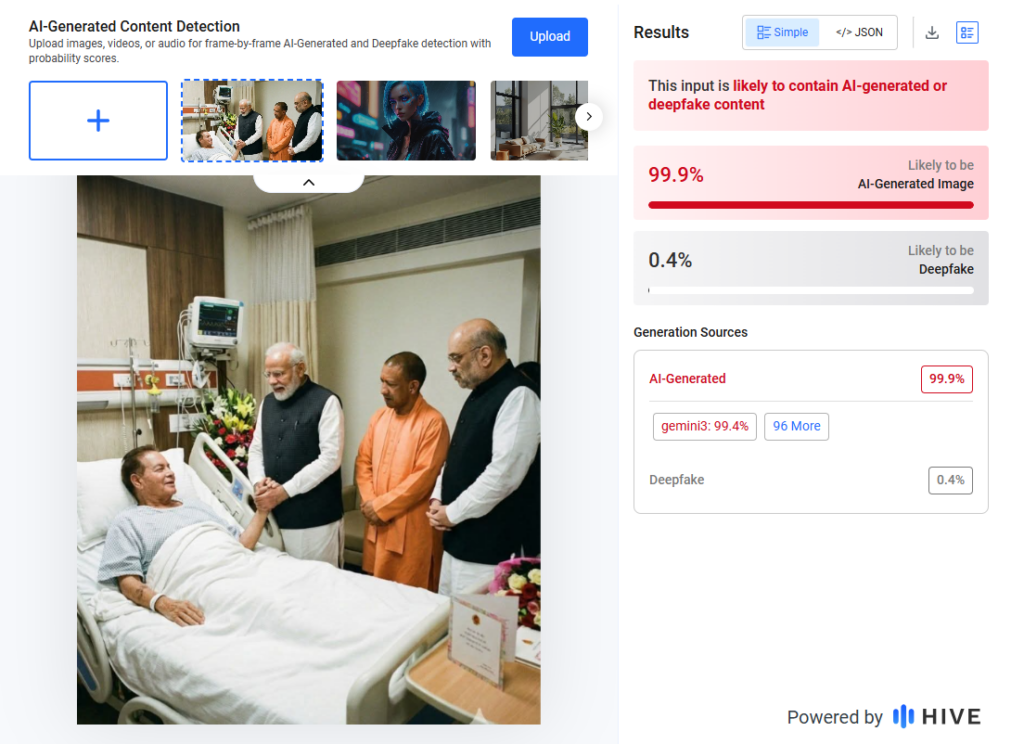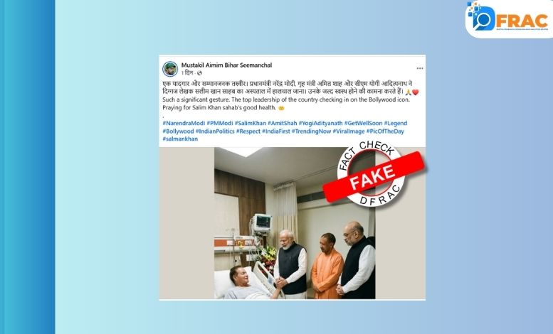DFRAC के फैक्ट चेक से साफ है कि प्रधानमंत्री नरेंद्र मोदी , मुख्यमंत्री योगी आदित्यनाथ और केंद्रीय गृहमंत्री अमित शाह का सलीम खान से अस्पताल में मुलाकात करने की तस्वीर AI द्वारा बनाई गई है।