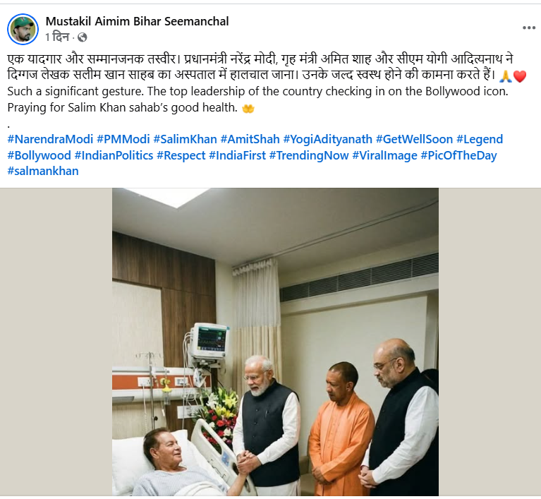 सोशल मीडिया पर एक फोटो तेज़ी से वायरल हो रहा है, जिसमें देखा जा सकता है कि प्रधानमंत्री नरेंद्र मोदी, केंद्रीय गृहमंत्री अमित शाह और उत्तर प्रदेश के मुख्यमंत्री योगी आदित्यनाथ ने अस्पताल का दौरा कर अभिनेता सलमान खान के पिता और मशहूर लेखक सलीम खान से मिले और उनका हाल जाना | तस्वीर को शेयर कर एक यूज़र ने लिखा “एक यादगार और सम्मानजनक तस्वीर। प्रधानमंत्री नरेंद्र मोदी, गृह मंत्री अमित शाह और सीएम योगी आदित्यनाथ ने दिग्गज लेखक सलीम खान साहब का अस्पताल में हालचाल जाना। उनके जल्द स्वस्थ होने की कामना करते हैं। “