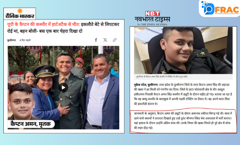 हमें अमन सिंह के निधन के संदर्भ में दैनिक भास्कर और नव भारत टाइम्स सहित कई मीडिया रिपोर्ट्स मिलीं। दैनिक भास्कर की रिपोर्ट में बताया गया है, ‘कुशीनगर के 25 साल के कैप्टन अमन सिंह की जम्मू-कश्मीर में हार्ट अटैक से मौत हो गई। रविवार को बारामूला में तबीयत बिगड़ने पर उनके साथी उन्हें कंधों पर उठाकर हेलीपैड तक ले गए। हेलिकॉप्टर से उन्हें श्रीनगर लाया गया, लेकिन डॉक्टर उनकी जान नहीं बचा सके। अमन सिंह की एक साल पहले बारामूला में पोस्टिंग हुई थी। वह कुशीनगर की हाटा तहसील के अब्दुल हमीद नगर के रहने वाले थे। अमन परिवार के इकलौते बेटे थे।’