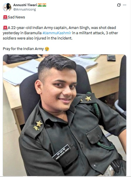 इस तस्वीर को शेयर करते हुए Annushi Tiwari नामक यूजर ने लिखा, ‘कल जम्मू-कश्मीर के बारामूला में एक आतंकवादी हमले में 22 साल के भारतीय सेना के कैप्टन अमन सिंह की गोली मारकर हत्या कर दी गई, इस घटना में 3 अन्य सैनिक भी घायल हो गए।’