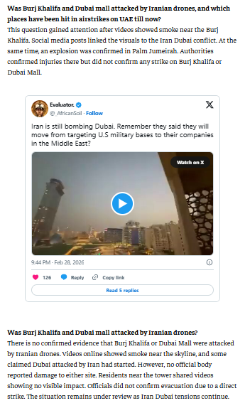 DFRAC के फैक्ट चेक से साफ है कि सोशल मीडिया पर दुबई के बुर्ज खलीफा में मिसाइल हमले और भीषण आग लगने का शेयर किया गया वीडियो फेक है। इस तरह के हमले की कोई आधिकारिक सूचना नहीं है। इसलिए यूजर्स का दावा फेक है।