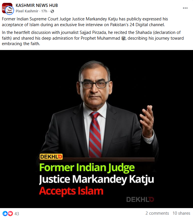 फेसबुक पर एक पोस्ट में दावा किया गया है, ‘भारतीय सुप्रीम कोर्ट के पूर्व न्यायाधीश जस्टिस मार्कंडेय काटजू ने पाकिस्तान के ’24 डिजिटल’ चैनल पर एक विशेष लाइव इंटरव्यू के दौरान सार्वजनिक रूप से इस्लाम धर्म को अपनाने की घोषणा की है। पत्रकार सज्जाद पीरज़ादा के साथ हुई इस दिल को छू लेने वाली बातचीत में, उन्होंने ‘शहादा’ (ईमान की गवाही) पढ़ा और पैगंबर मोहम्मद (सल्लल्लाहु अलैहि व सल्लम) के प्रति अपनी गहरी श्रद्धा व्यक्त करते हुए, इस धर्म को अपनाने तक के अपने सफ़र के बारे में बताया।’