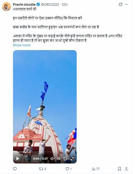 इस वीडियो को शेयर करते हुए एक यूजर ने लिखा, ‘भजनलाल शर्मा जी इन जहरीले लोगों पर ऐसा एक्शन लीजिए कि मिशाल बने बाबा साहेब के नाम जातिगत हुड़दंग अब चरमपंथी रूप लेता जा रहा है अलवर में मंदिर के गुंबद पर चढ़ाई करके नीले झंडे लगाना मंदिर पर हमला है अगर मंदिर इतना ही प्यारा है तो सर झुका कर जाओ तुम्हें कौन रोकता है’
