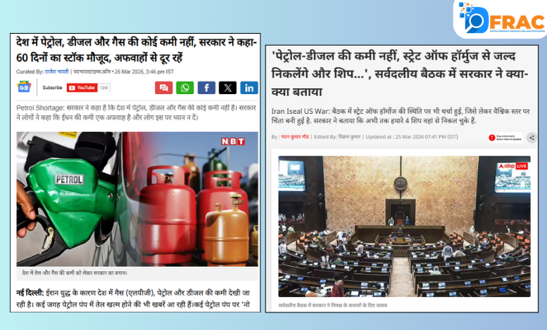 DFRAC के फैक्ट चेक से साफ है कि सोशल मीडिया पर किया गया दावा फेक है। पेट्रोलियम और प्राकृतिक गैस मंत्रालय ने नहीं कहा कि देश में सिर्फ 2 दिन का पेट्रोल बचा है। आधिकारिक बयान के मुताबिक देश में पेट्रोल, डीजल और एलपीजी की कोई कमी नहीं है।