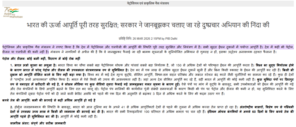 इस प्रेस रिलीज में पेट्रोलियम और प्राकृतिक गैस मंत्रालय के हवाले से बताया गया है, ‘पेट्रोलियम और प्राकृतिक गैस मंत्रालय ने स्पष्ट किया है कि देश में पेट्रोलियम और एलपीजी की आपूर्ति की स्थिति पूरी तरह सुरक्षित और नियंत्रण में है। सभी खुदरा ईंधन दुकानों में पर्याप्त आपूर्ति है। देश में कहीं भी पेट्रोल, डीजल या एलपीजी की कमी नहीं है। मंत्रालय ने नागरिकों से अपील की है कि वे जानबूझकर फैलाई जा रही भ्रामक सूचनाओं के सुनियोजित अभियान से गुमराह न हों, इसका उद्देश्य अनावश्यक दहशत फैलाना है।’