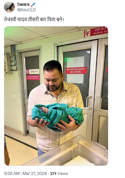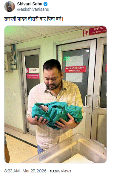 सोशल साईट X (पूर्व ट्विटर) पर वेरिफाइड यूजर शिवानी साहू ने वायरल तस्वीर को शेयर कर लिखा कि तेजस्वी यादव तीसरी बार पिता बने