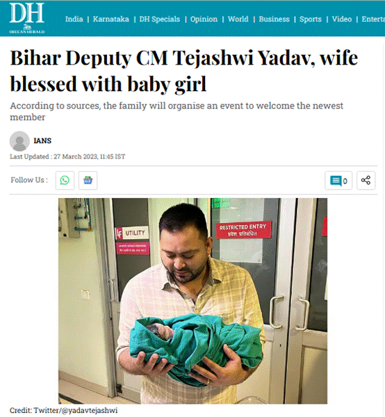 वायरल तस्वीर की सच्चाई जानने के लिए रिवर्स इमेज सर्च किया गया। जांच के दौरान यही तस्वीर Deccan Herald की एक खबर में मिली, जो 27 मार्च 2023 को प्रकाशित हुई थी। रिपोर्ट के अनुसार, यह तस्वीर उस समय की है जब तेजस्वी यादव पहली बार पिता बने थे और उनके घर बेटी का जन्म हुआ था।