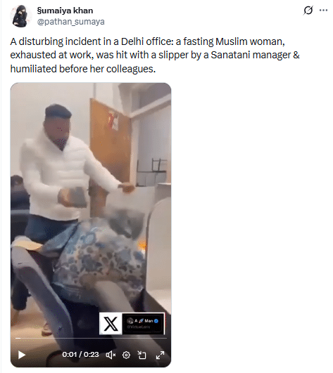 एक्स (पूर्व ट्विटर) पर §umaiya khan नामक यूजर ने इस वीडियो को शेयर करते हुए लिखा, ‘दिल्ली के एक दफ़्तर में एक परेशान करने वाली घटना सामने आई है: रोज़ा रख रही एक मुस्लिम महिला, जो काम के कारण काफ़ी थक गई थी, उसे एक सनातनी मैनेजर ने चप्पल से मारा और उसके सहकर्मियों के सामने उसे ज़लील किया।‘ (हिन्दी अनुवाद)