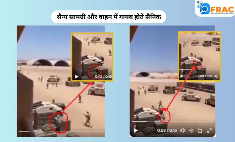 DFRAC की टीम ने वायरल वीडियो की जांच में पाया कि यह जॉर्डन और मध्य-पूर्व में स्थित किसी भी अमेरिकी बेस पर हमले का चीन द्वारा जारी किया गया फुटेज नहीं है। इस वीडियो को आर्टिफिशियल इंटेलिजेंस (AI) की मदद से बनाया गया है। वीडियो को गौर से देखने पर हमने पाया कि 2 सैनिक अचानक से दृश्य से रहस्यमयी तरीके से हो जाते गायब हैं। एक सैनिक सैन्य सामग्री में समा जाता है, तो वहीं दूसरा सैन्य वाहन में गायब हो जाता है, जिसे यहां दिए ग्राफिक्स में देखा जा सकता है। यह दृश्य पैटर्न स्पष्ट करता है कि वायरल वीडियो AI-जनरेटेड है।